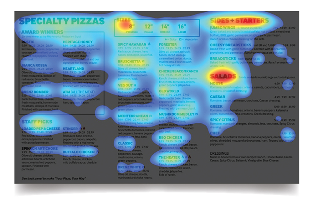 This is an example of an eye tracking analysis. Within the first 3-5 seconds, 82% of customers focused on the photo of the pepperoni pizza on the middle of the page, 69% on the profitable make-your-own pizza section and 56% on the steak sandwiches & wraps.